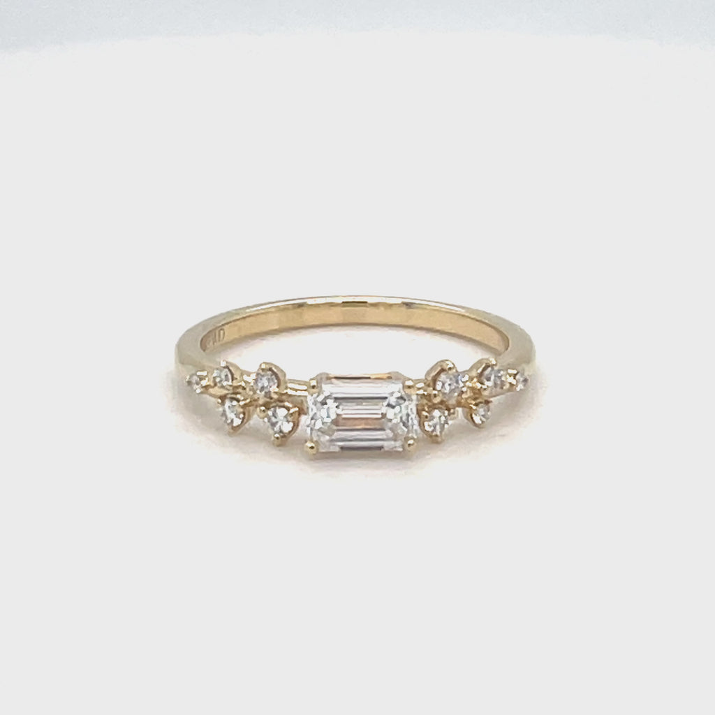 An emerald cut lab grown diamond flanked by a mini version of our classic Athena setting!