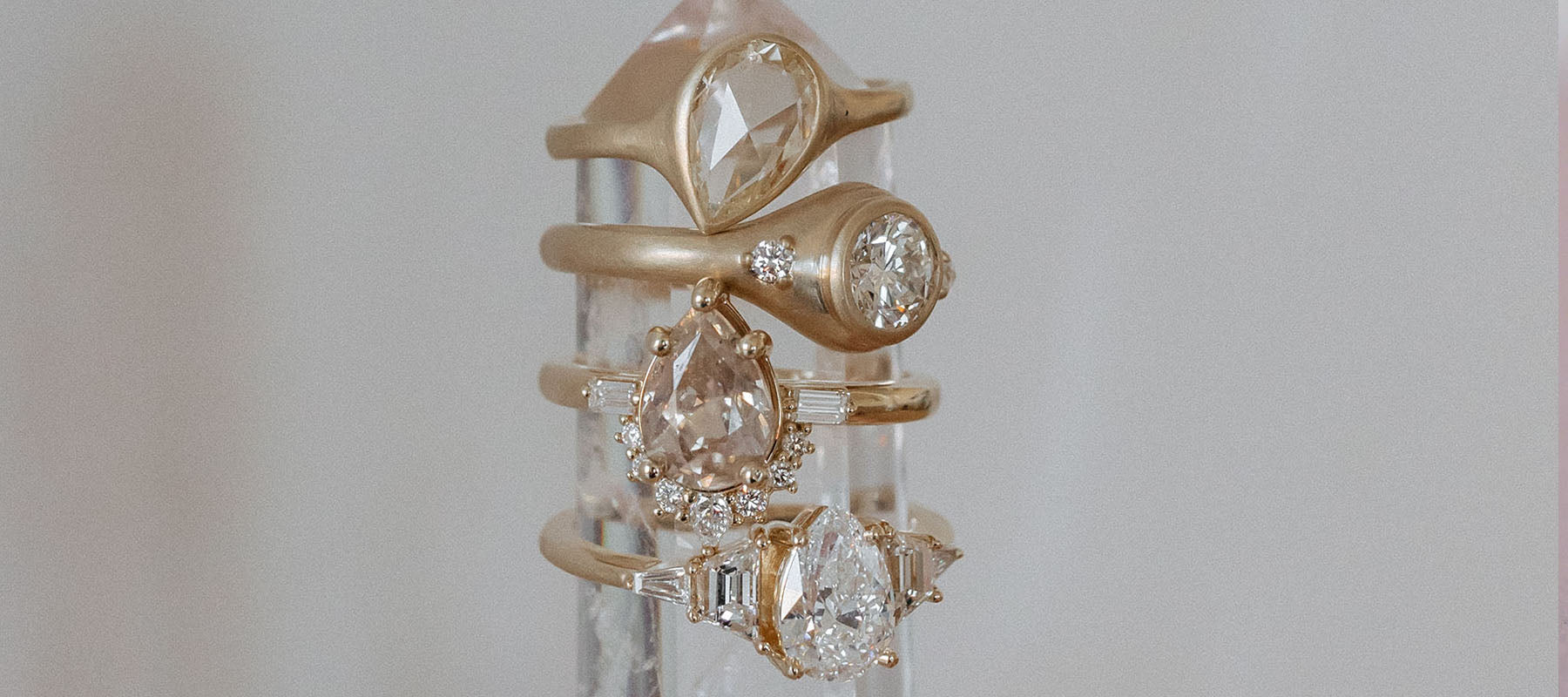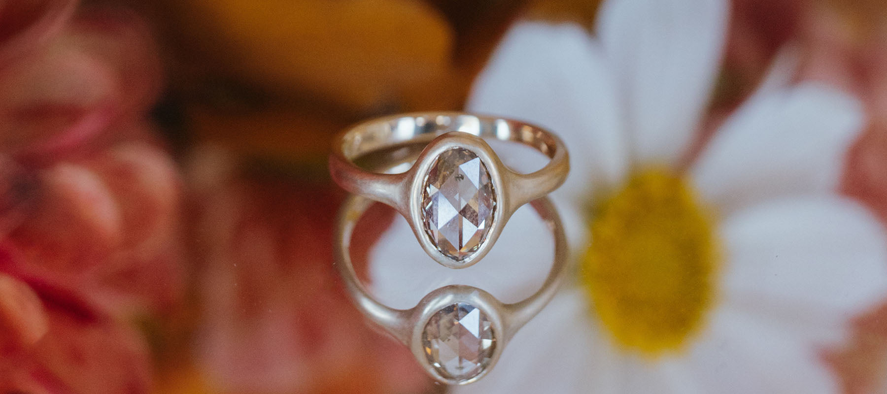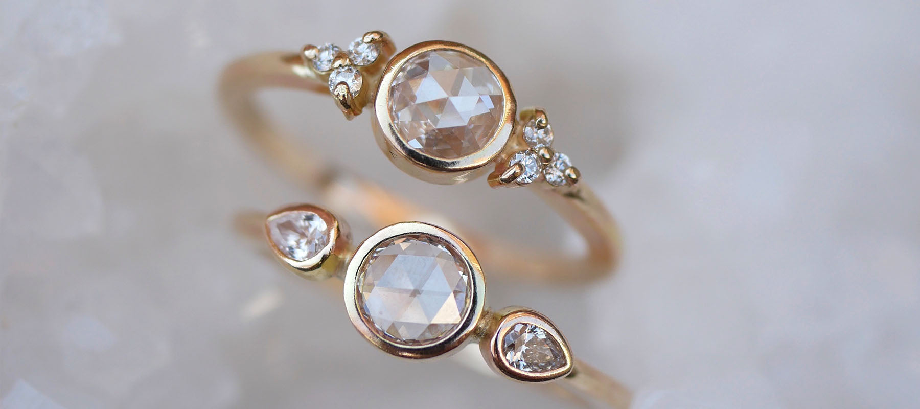 There are rose-cut, emerald cut, brilliant cut, marquise, round and oval cut for diamond, moissanite, and white sapphire! All of these stones are used to achieve that timeless white stone look. We can design simple and traditional, or add side stones, stone clusters, stacking bands and more to make it unique to you.