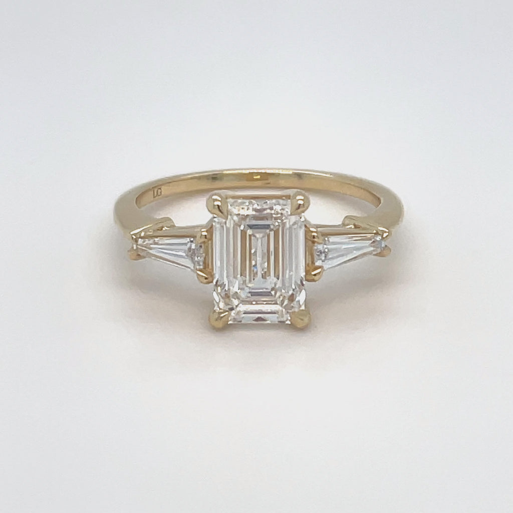 Emerald Cut Lab formed step-cut diamond flanked by a pair of lab grown tapered baguette diamonds in a 14k yellow gold setting.